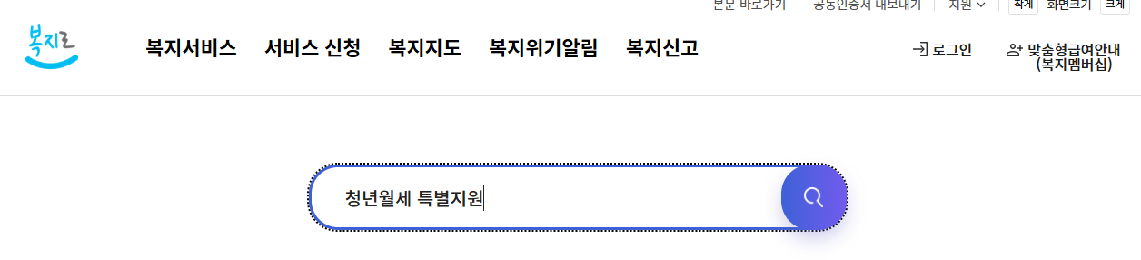 복지로 사이트 내 청년월세 특별지원 검색화면